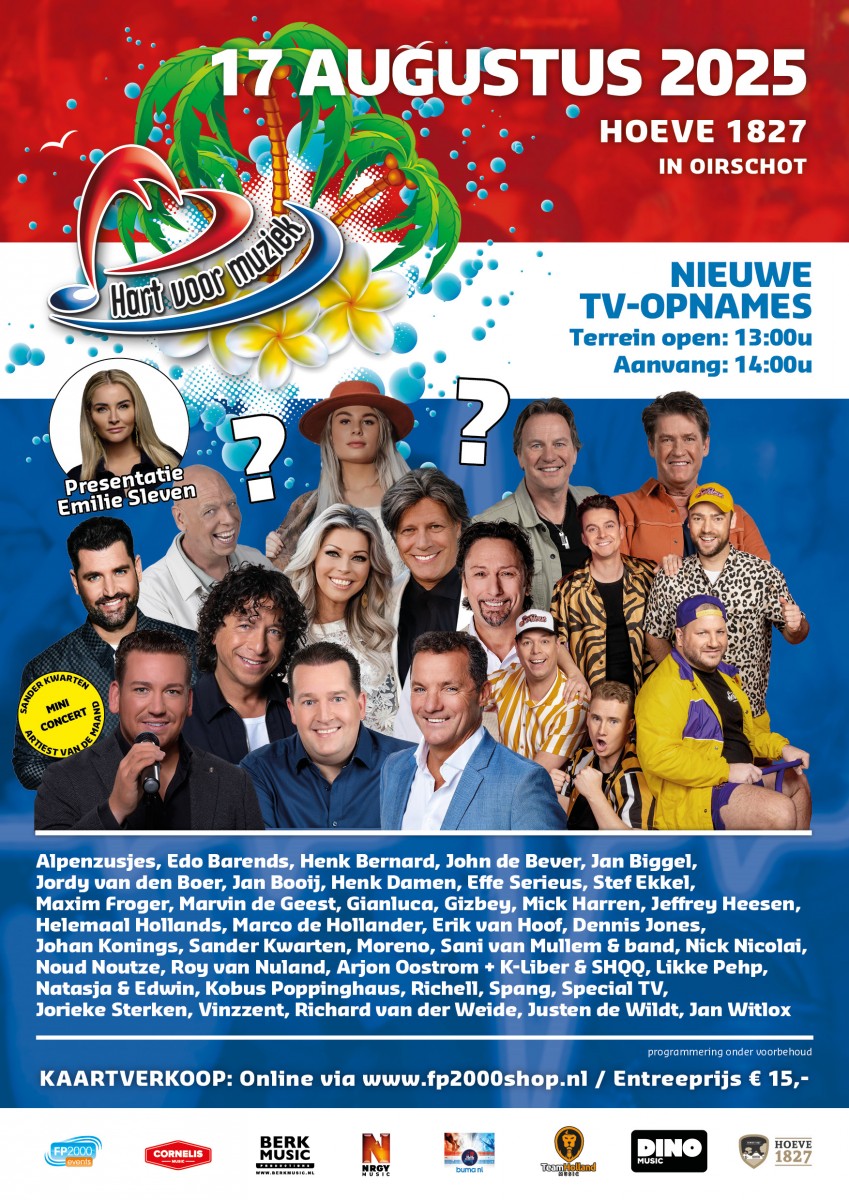 Wilt u een keer een opnamedag van Hart voor Muziek bijwonen? Dat kan, de tweede 'Oirschotse' opnamedag is op zondagmiddag 17 augustus bij Hoeve 1827 aan de Oude Grintweg 90 in Oirschot. Noteer deze datum alvast in uw agenda! Kaarten voor deze opnamedag kunt u tzt online boeken via www.fp2000shop.nl voor slechts 15 euro per persoon.